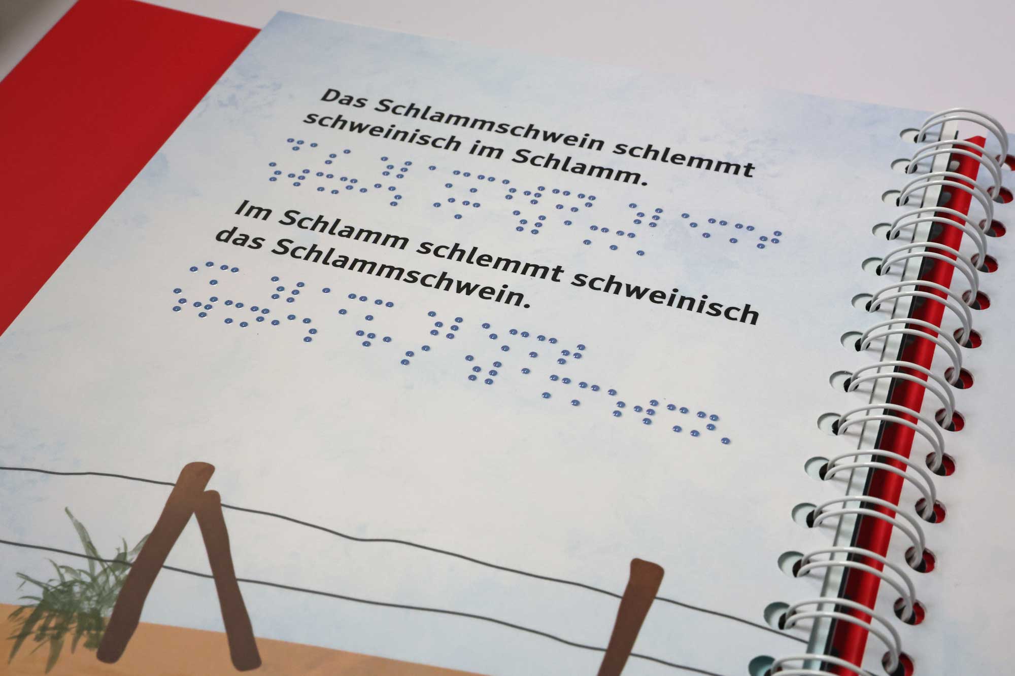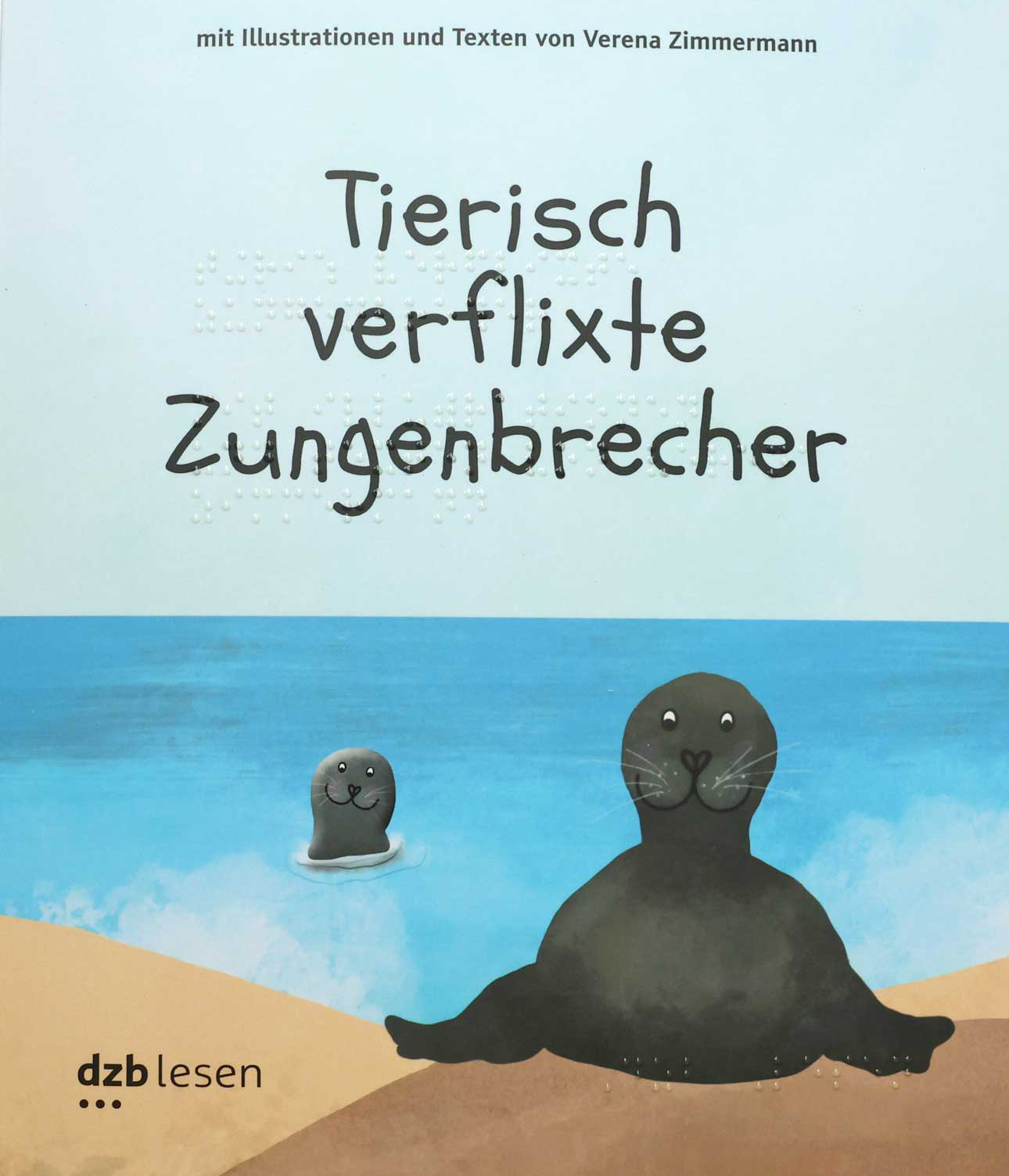 Im Jahr 2023 startet sie mit einem Stipendium der Kunststiftung Sachsen-Anhalt ein neues Buchprojekt. Mit dem Prototyp von „Tierisch verflixte Zungenbrecher“ präsentiert die Künstlerin ihre neuen Ideen beim Verlag des dzb lesen. Sie mag das Spiel mit der Sprache: Gedichte mit Reimen, Zungenbrecher, die Minigeschichten erzählen und durch ihre schwierige Aussprache zum Schmunzeln anregen. In ihrem taktilen Kinderbuch hat sie sieben Zungenbrecher mit Tieren ausgewählt, die noch wenig bekannt und nicht zu lang sind. Einen Zungenbrecher schrieb sie sogar selbst, den mit dem Schwein, verrät sie und lacht. Verena Zimmermann blättert im Buch und schaut sich die tastbaren Tiere an: Robben, Klapperschlangen, Schwein, Huhn, Fisch, Schildkröte und Murmeltier. „In meinem Prototyp gab es noch die Elefantentanten und zehn zahmen Ziegen, die dann aber nicht in die nähere Auswahl kamen.“ Die farbigen Punkte der Brailleschrift sind ein Blickfang im Buch und stehen gleichwertig neben der Schwarzschrift. Ergänzt werden der Text und die tastbaren Elemente durch einfache Illustrationen, die die Künstlerin selbst entworfen hat. So können sowohl sehende als auch blinde Menschen das Buch gemeinsam entdecken.