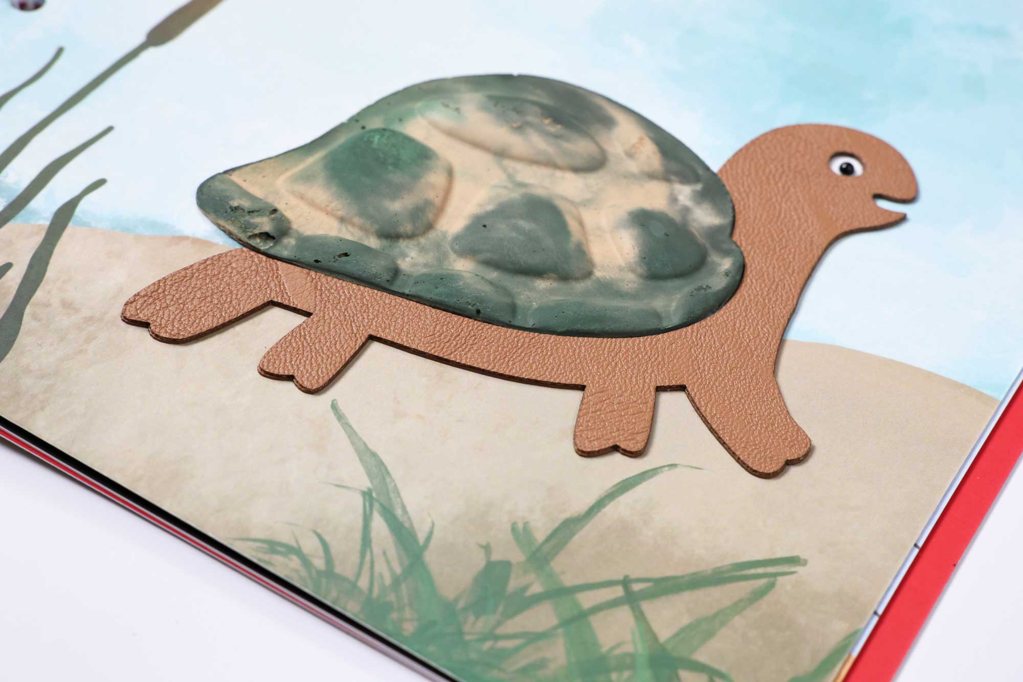 Die Auswahl des Materials für die taktilen Elemente war nicht nur eine technische Herausforderung, sondern auch ein kreativer Prozess. Gemeinsam mit Antje Mönnig, Kommunikationsdesignerin im dzb lesen und Autorin mehrerer taktiler Kinderbücher, suchte sie nach geeigneten Textil- und Papiermaterialien, die sowohl funktional als auch ästhetisch ansprechend waren. „Wir mussten ständig abwägen, welches Material die besten taktilen Eigenschaften hat und gleichzeitig die Illustrationen unterstützt“, erklärt Zimmermann und zeigt auf das Truthuhn im Buch. „Das war gar nicht so leicht. Den Stoff dafür habe ich aus einem Stoffladen aus Berlin. Die Schlangen waren zuerst aus einem Kunstleder, das sich nicht so gut für das Lasern eignete. Dann haben wir ein anderes Kunstleder gefunden.“