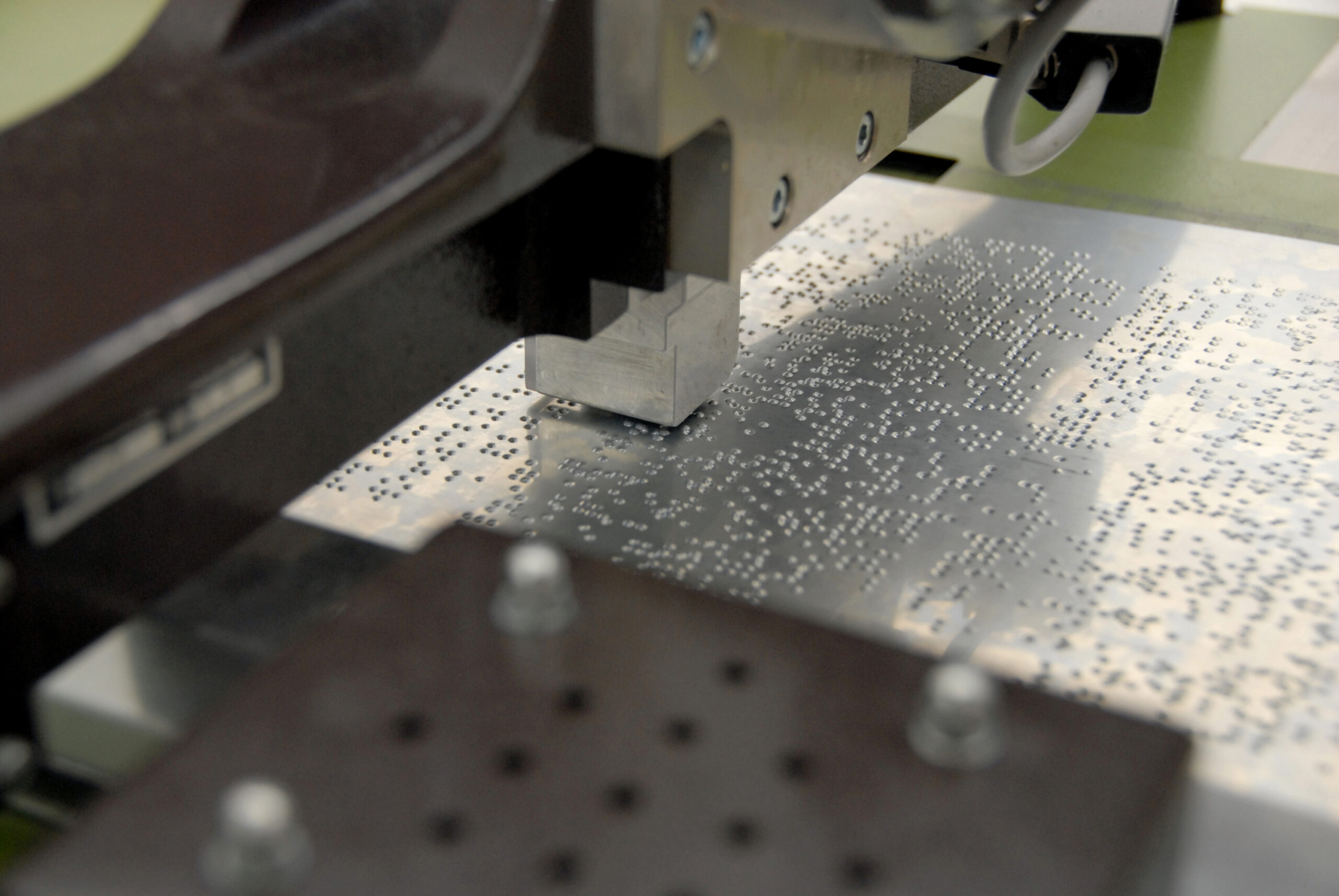 Später bis Anfang der 1990er Jahre setzte man mechanische Punziermaschinen ein. Das war eine sehr laute und körperlich schwere Angelegenheit für die Übertragerinnen und Übertrager. Das Punzieren (das Prägen der Punkte in eine Zinkblechplatte) ermöglicht die Herstellung von Brailleschrift auf Papier mit mehreren Abzügen.